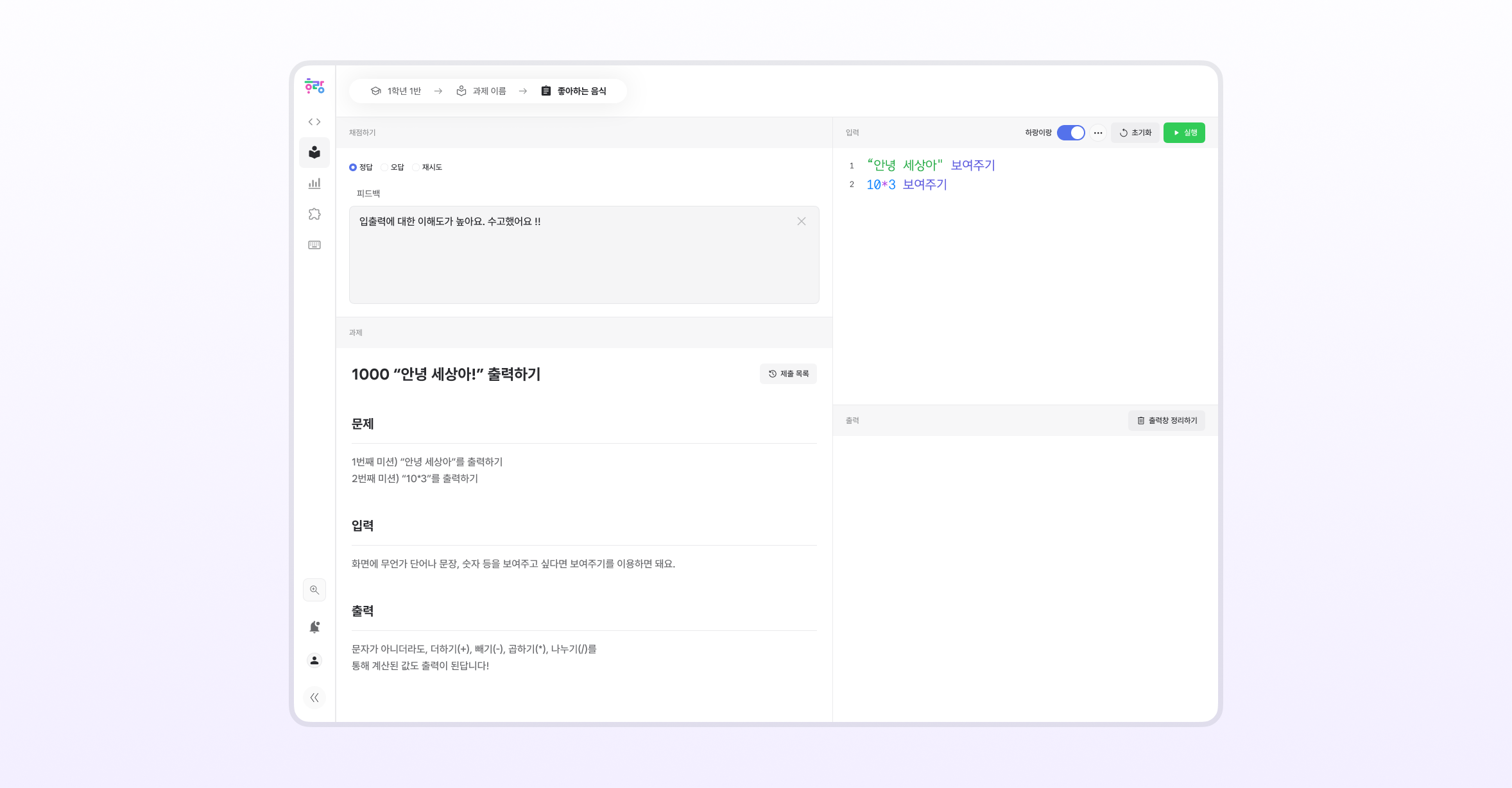 과제에 따라 정답 / 오답 / 재시도 안내가 표시될 수 있어요.