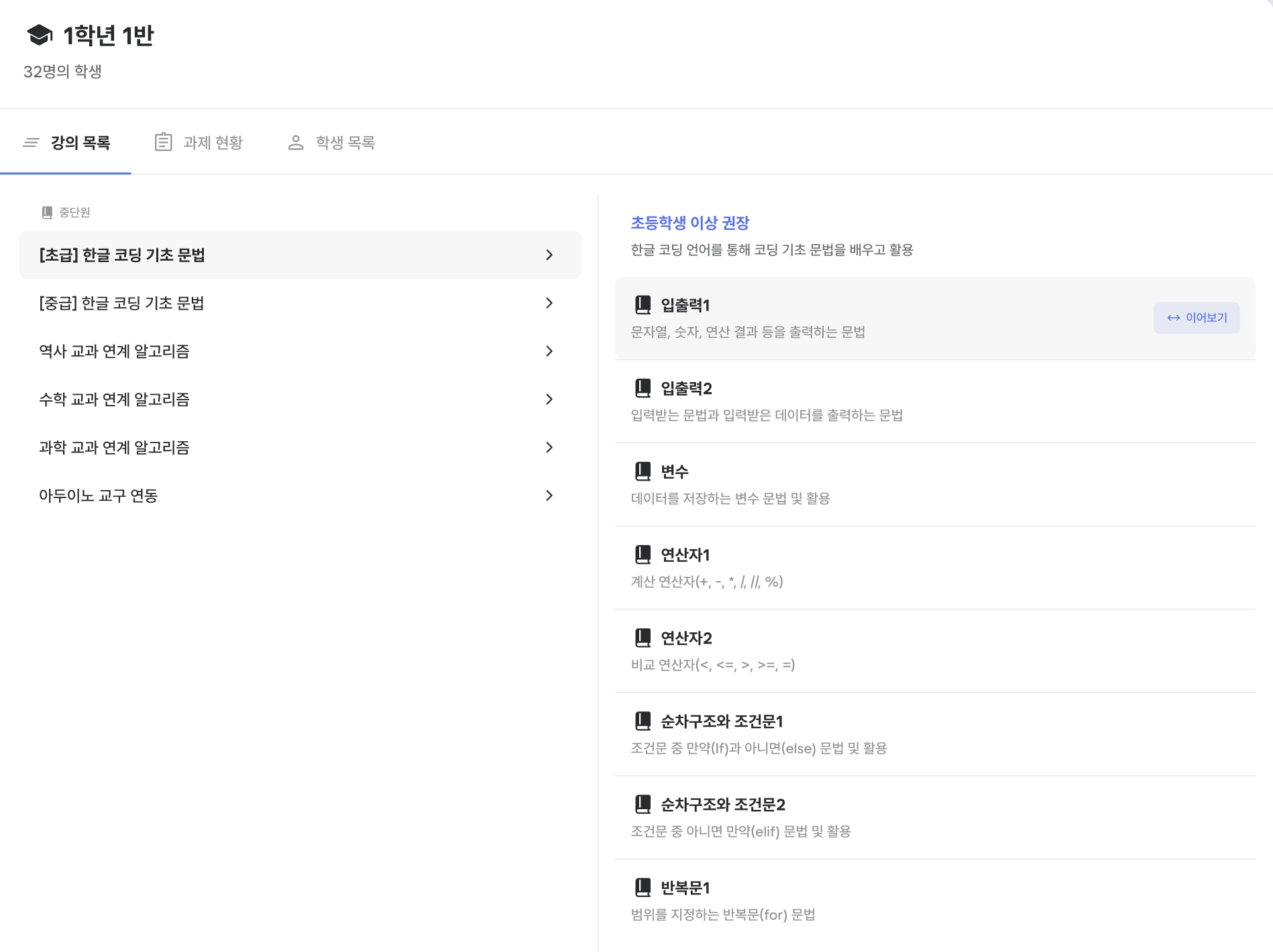우리 교실에서 어떤 강의를 듣는지 확인하고 싶을 때