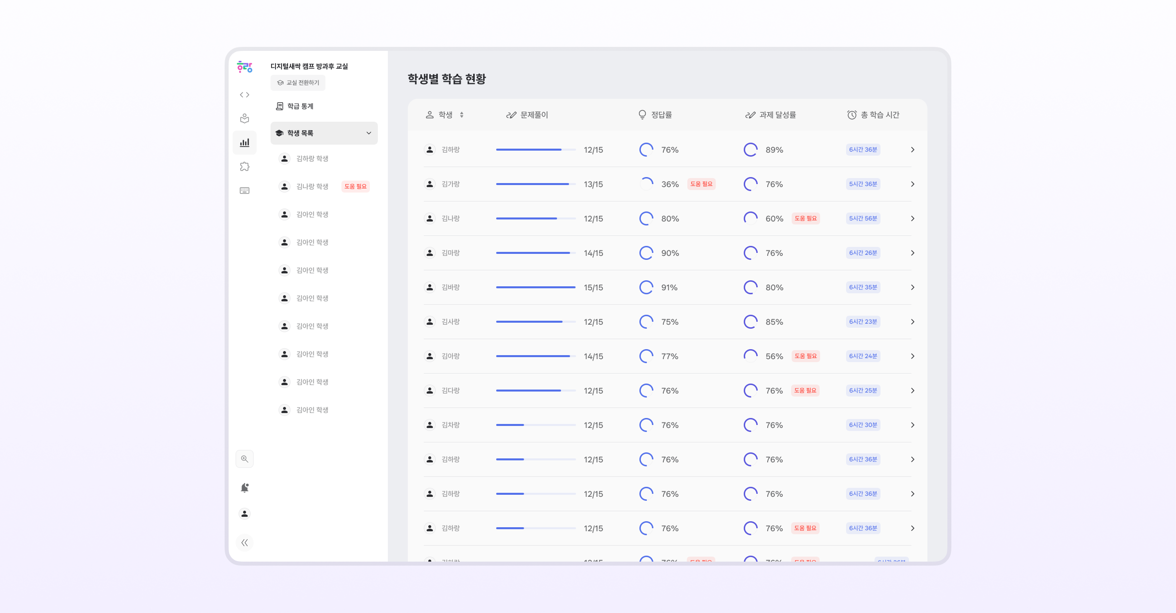 학급에 속한 학생들의 학습 현황을 한눈에 볼 수 있어요.