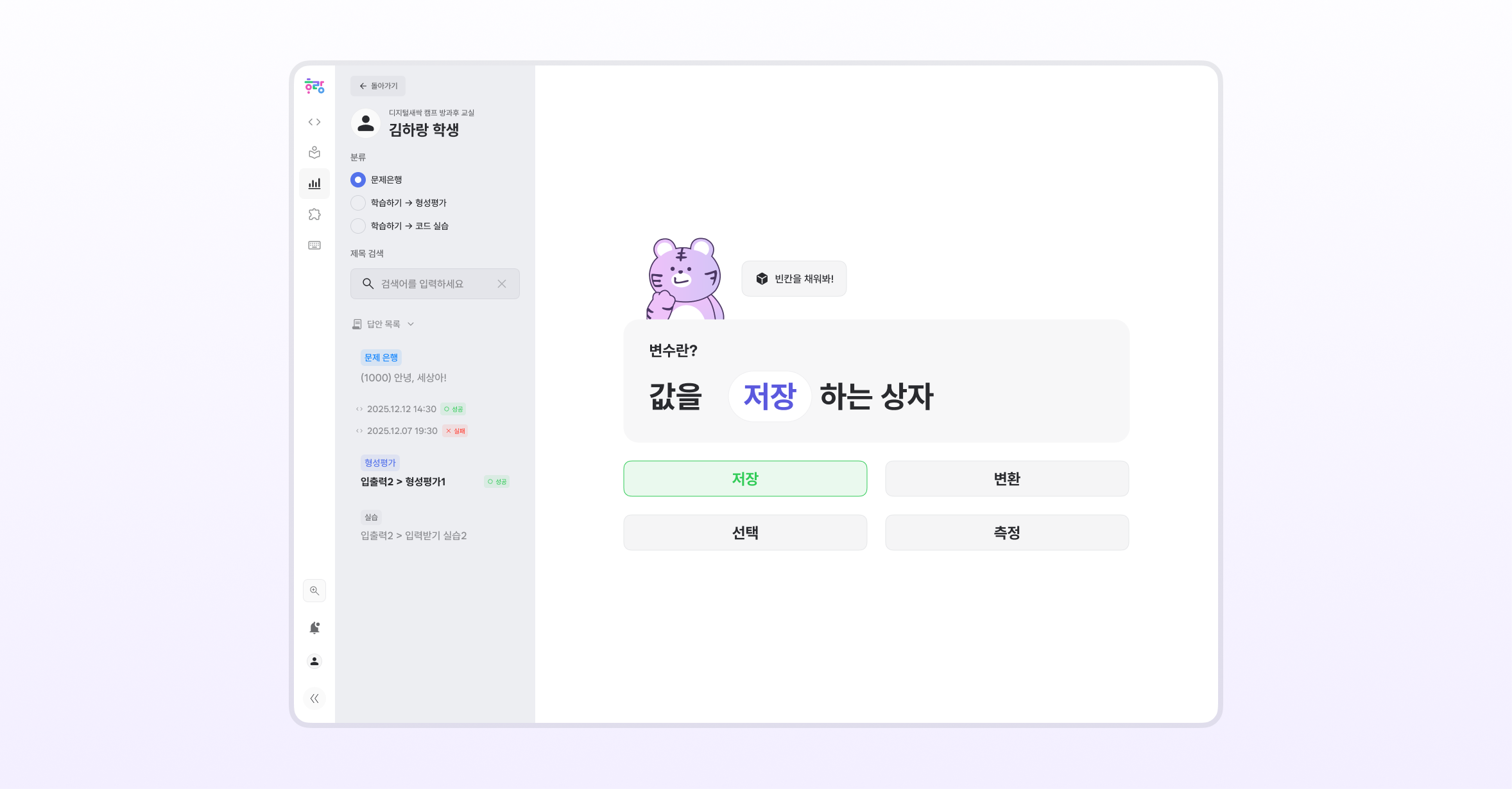 학생을 선택하면해당 학생의 학습 데이터를 자세히 확인할 수 있어요.
