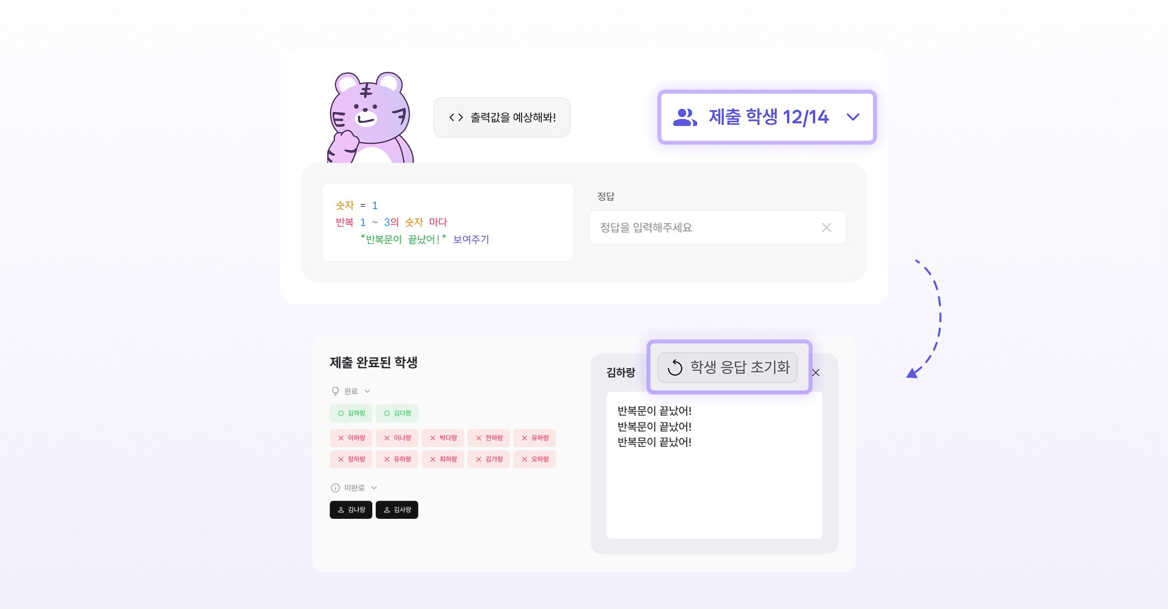 선생님은 학생들이 제출한 답안을 확인할 수 있어요.