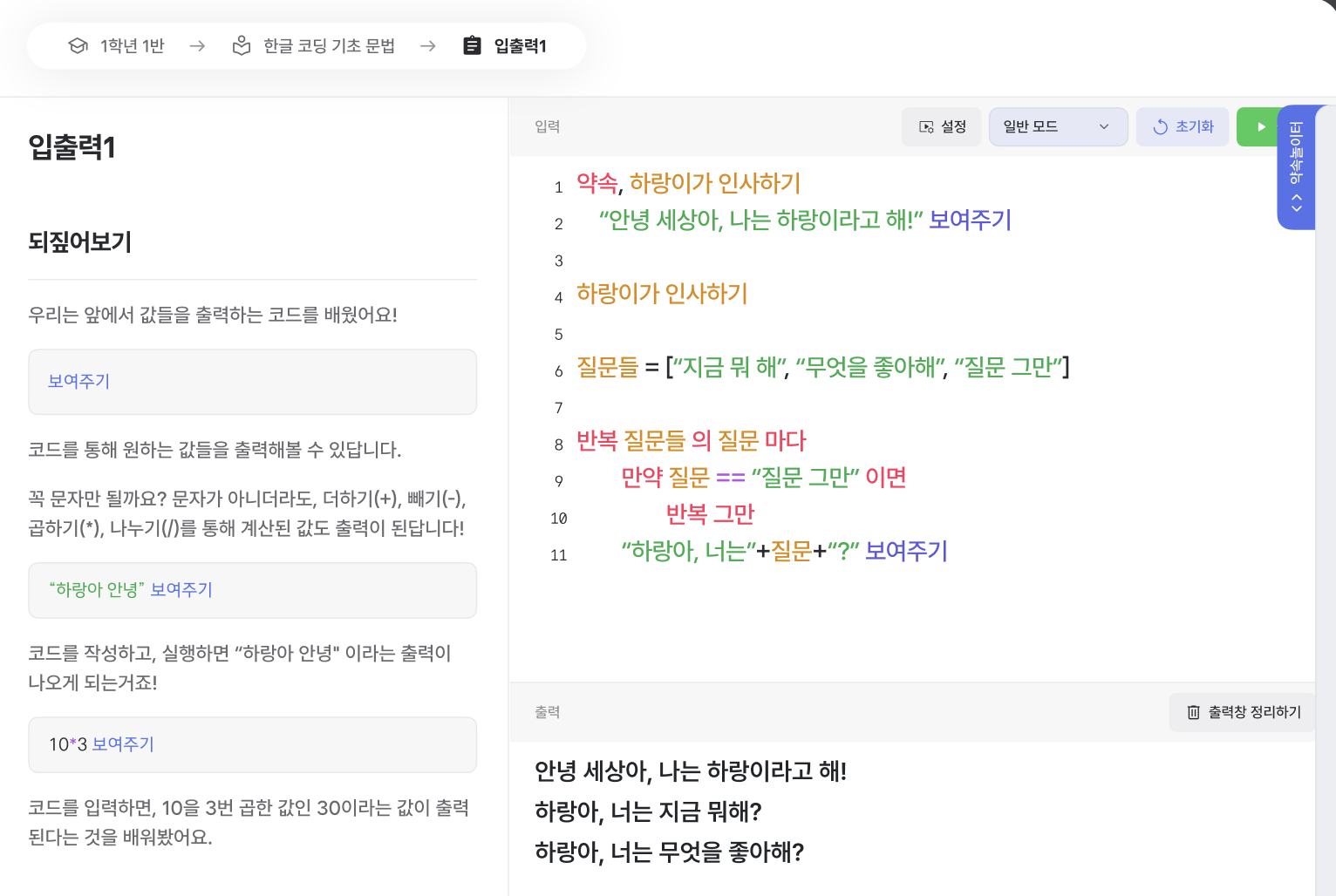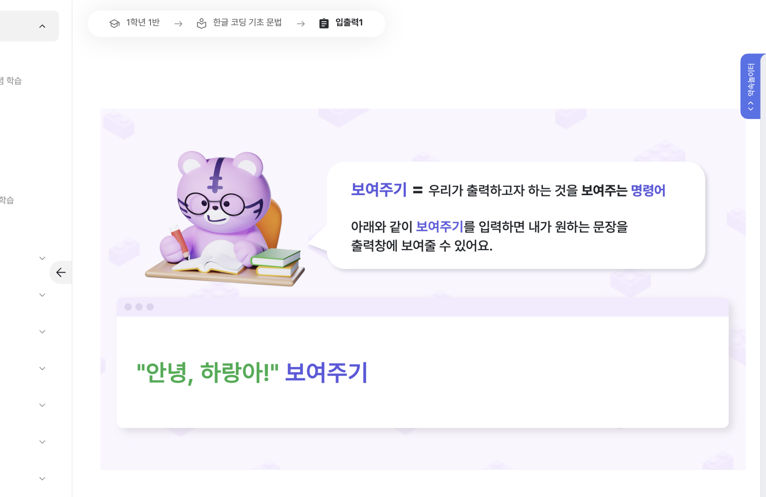 실습 화면을 제외한 모든 수업 자료 페이지의 오른쪽 사이드에 팝업 약속놀이터(코드 에디터)가 제공돼요.