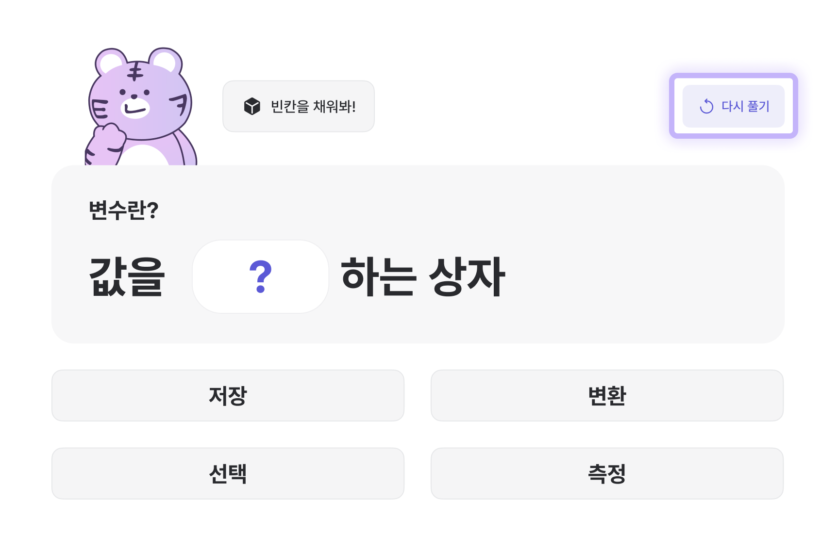 오답일 경우 재시도 버튼을 눌러 다시 풀 수 있어요.