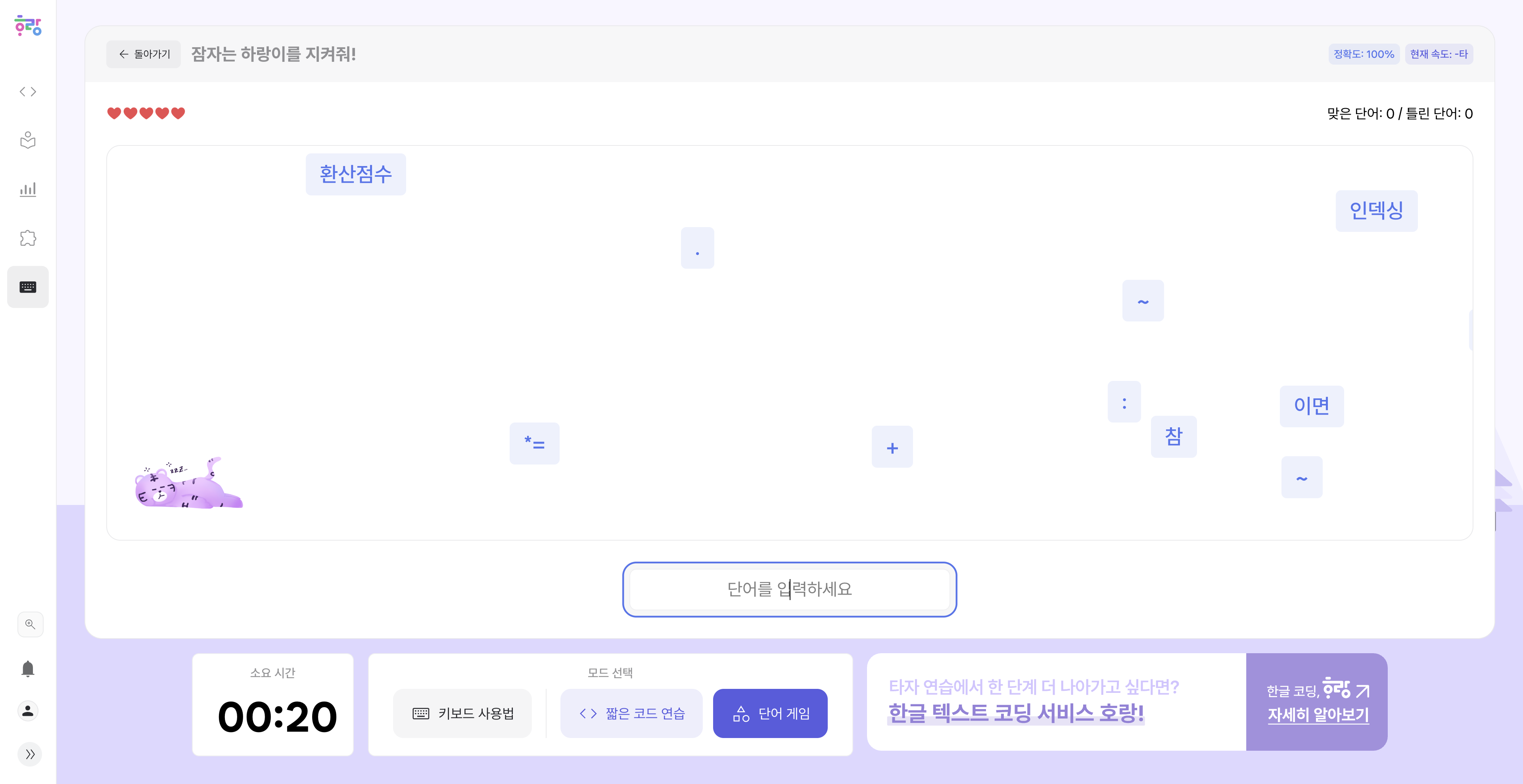 호랑 서비스 내 타자게임 탭에서 바로 시작할 수 있어요.