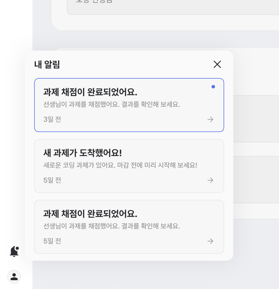 알림을 선택하면 해당 과제나 학습 화면으로 바로 이동해요.